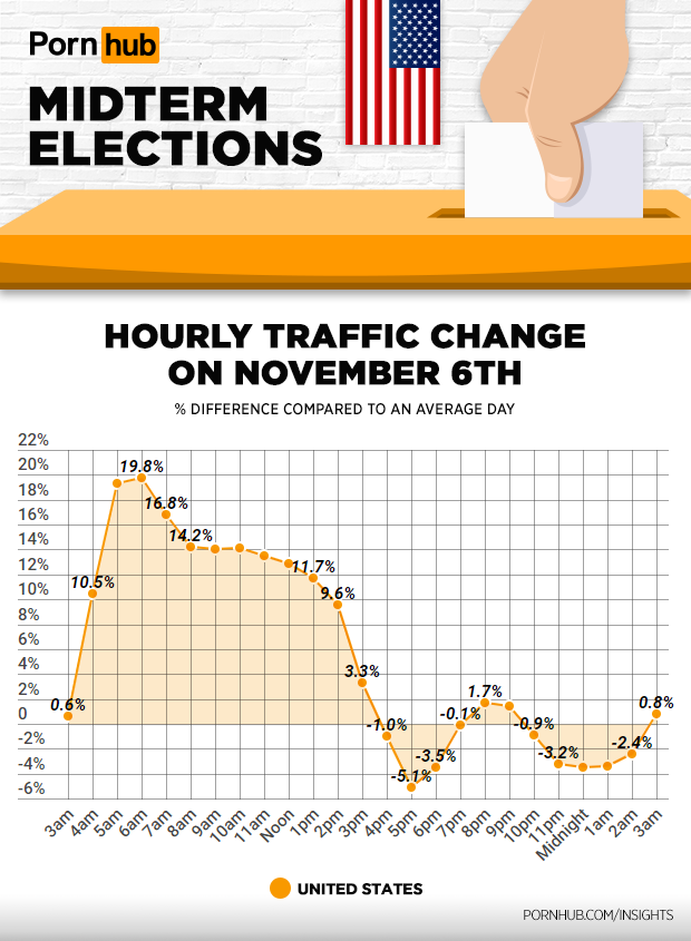 Midterm elections took place in the United States on November 6th, as voters headed to the polls to choose who their representatives in the House and Senate would be for the next four years. Rather than analyzing what the political results might be, Mashable asked Pornhub’s statisticians to see how election day affected Pornhub’s traffic.