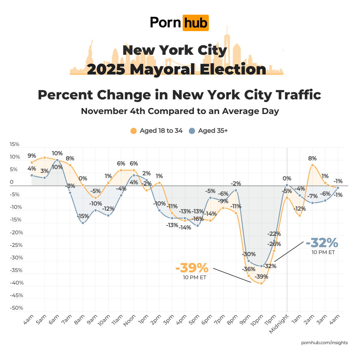 They were also more likely to skip Pornhub in the evening in order to follow the election results. Between 6pm and 1am, traffic from the 18-35 age group fell further below average compared to their older counterparts. Their lowest point was at 10pm, when traffic dropped to –39%, while the 35+ group saw a smaller decrease of –32% for the same time period.