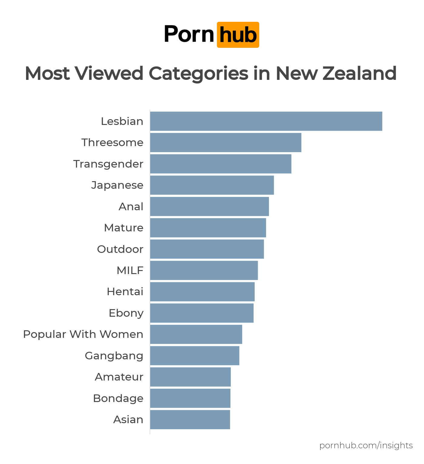 Pornhub’s video categories are the same throughout the world, so the following chart indicates the type of porn that is most often viewed in New Zealand. Lesbian tops the list, followed by Threesome and Transgender.