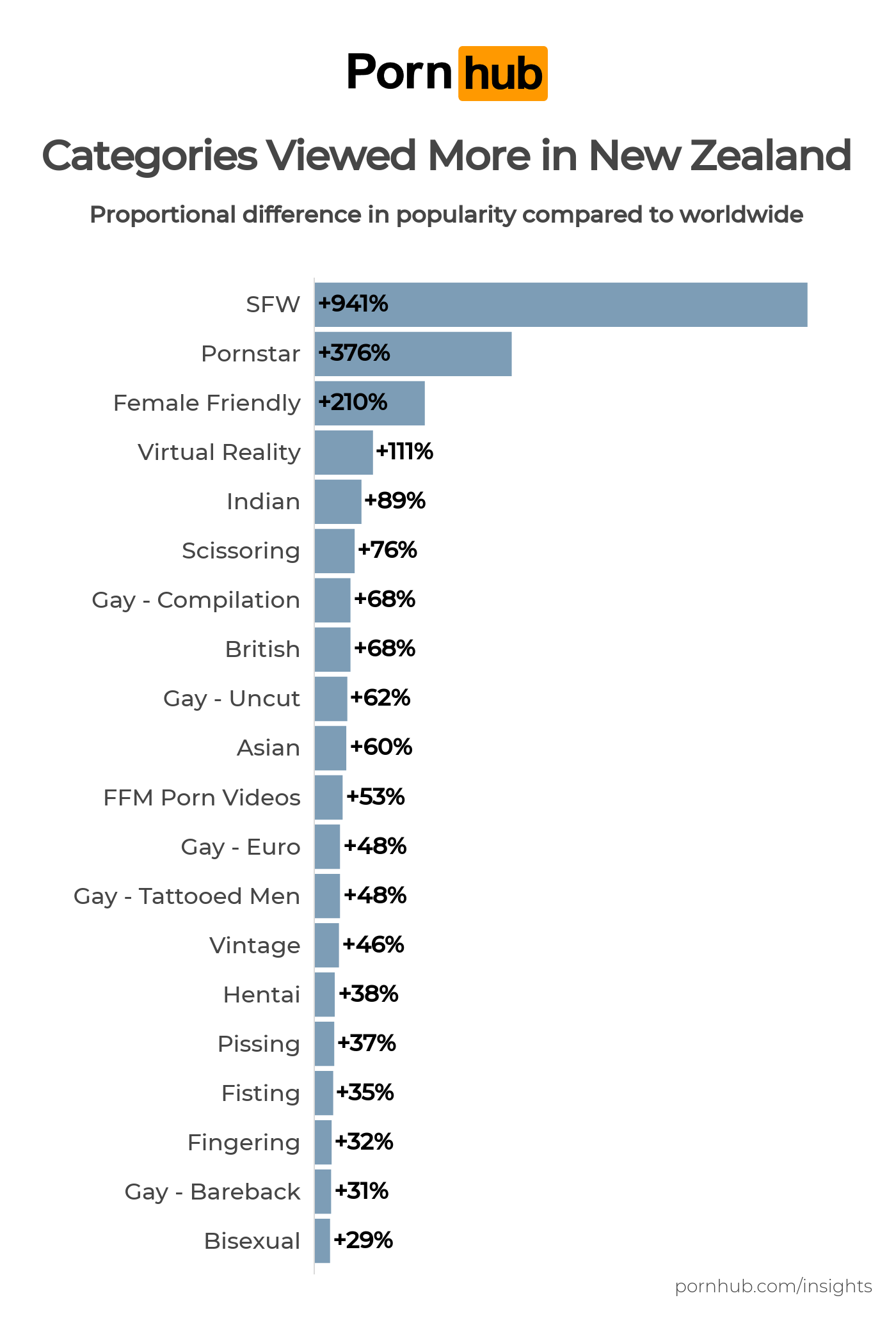 The following chart shows which categories are proportionately more likely to be viewed in New Zealand when compared to the rest of the world. Kiwis are +941% more likely to view Safe for Work content on Pornhub, +210% more into Female Friendly videos, and +111% more likely to watch Virtual Reality content.