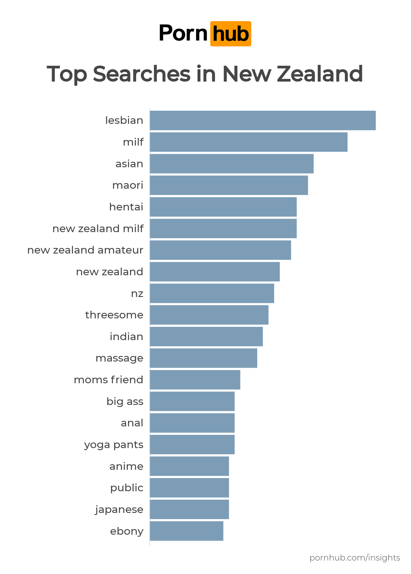 In this edition of Pornhub Insights, we’re joined by our friends at LADbible NZ to take a closer look at the porn viewing preferences of New Zealand. The most popular search among Kiwis is “lesbian”, followed by “milf” and “asian”. Seraches for “Maori”, the indigenous people of New Zealand, are greater than those containing “New Zealand”.