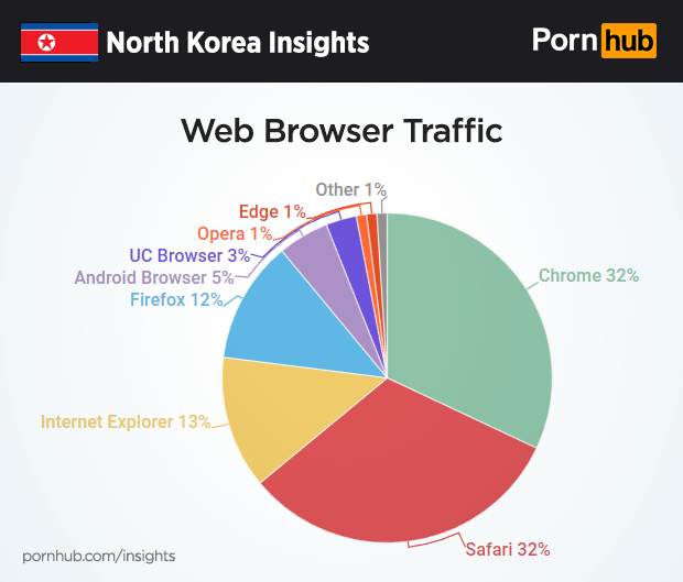 Worldwide, Google’s Chrome browser makes up 51% of all traffic coming to Pornhub, but in North Korea it’s much less at 32%. Much of that difference is made up with Apple’s Safari browser, accounting for 32% in North Korea but only 9% elsewhere in the world.