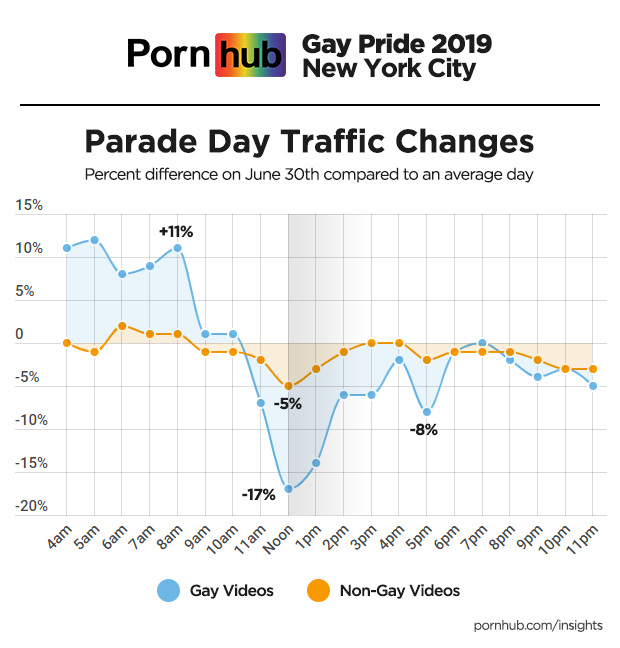 Traffic changes were broken down by visitors who viewed gay (male) (NSFW) oriented video pages, and those viewing non-gay videos. At noon when the parade began, traffic to gay pages was down by -17% and non-gay traffic was down by -5% when compared to an average day.