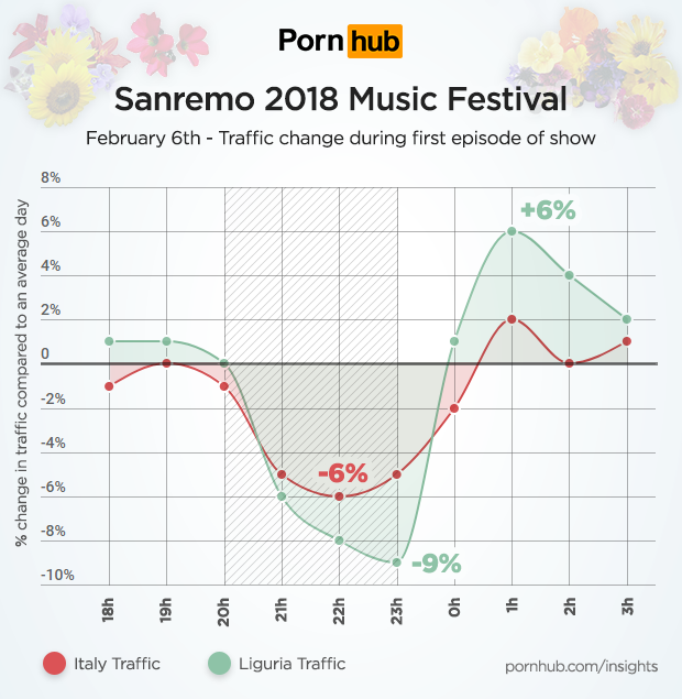 We experienced the biggest drop (6%!) at 10 p.m. while Fiorello and Claudio Baglioni were singing together one of the most famous Italian songs “E tu”, and maybe all the Italians were singing along with them and not thinking about porn.