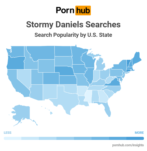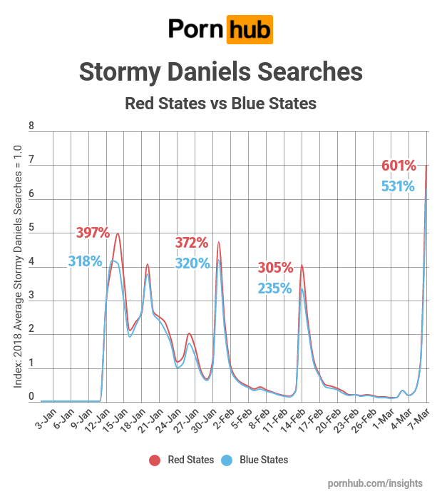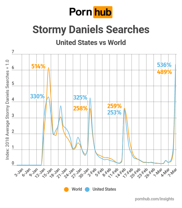 When compared to her 2018 average, searches on January 14 were 514% higher worldwide, and 330% higher in the United States. On January 31, Stormy Daniels appeared on Jimmy Kimmel Live! which caused a 325% increase in U.S. searches and 258% worldwide.