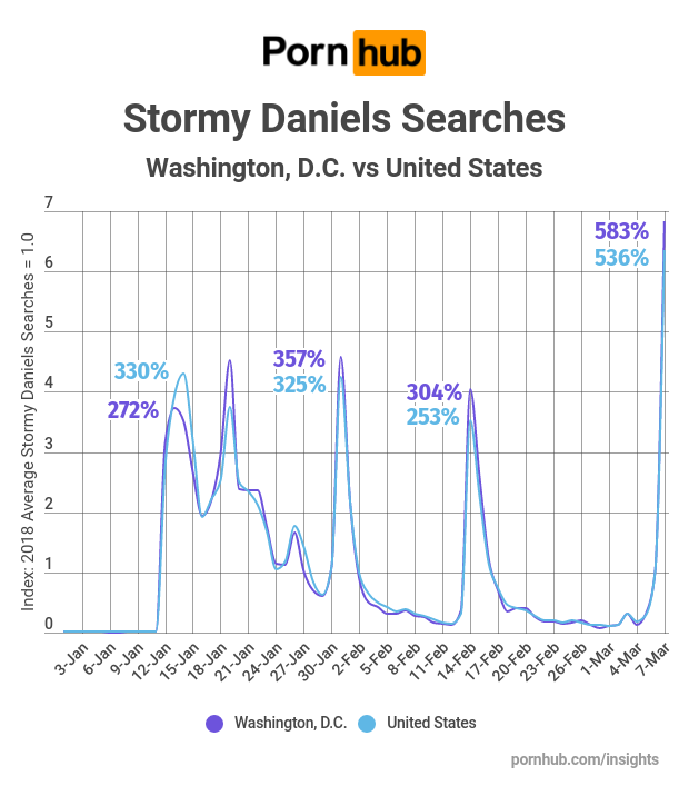 Due to the political nature of the affair, our statisticians next compared Stormy Daniels searches in Washington D.C. to that of the United States. At all points after the initial story came out, Pornhub visitors from D.C. were more likely to see increased searches for Stormy Daniels than visitors elsewhere in the U.S.