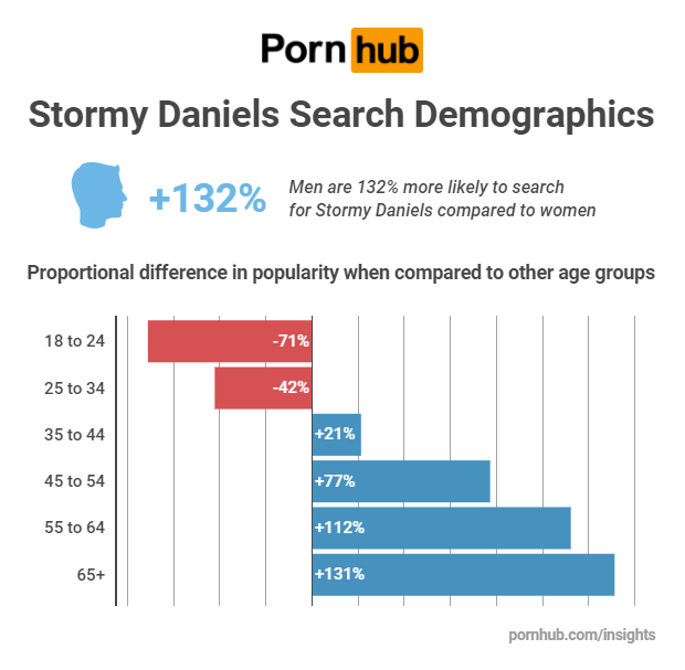 Our data shows that male visitors are 132% more likely to search for Stormy Daniels compared to female visitors. Millennials aged 18-34 are far less likely to search for Stormy Daniels when compared to visitors over the age of 35. Proportionately, the demographic most likely to search for Stormy Daniels is men over the age of 65.