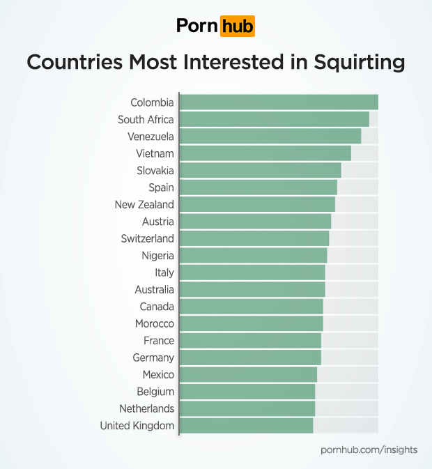 Worldwide, visitors from Colombia are far more likely to search for squirting videos than in other countries, as are visitors from South Africa, Venezuela, Vietnam and Slovakia.