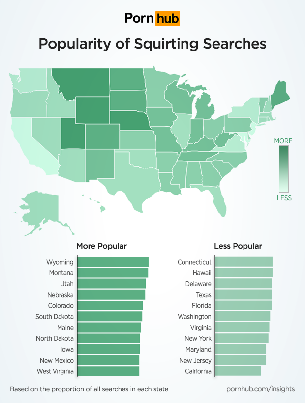 Visitors from Wyoming, Montana, Utah and Nebraska are proportionately the most interested in searching for squirting videos. Visitors from California, New Jersey, Maryland and New York are the least interested in squirting.