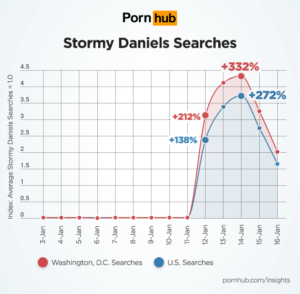 AVN Hall of Fame pornstar Stormy Daniels (nsfw) has appeared in adult videos since the early 2000s, but recently shot to the forefront of public attention when her back-door dealings with U.S. President Trump were revealed. Newsweek contacted us to see how the story may have affected searches on Pornhub. Our analytics data revealed that Stormy’s story sent millions of curious visitors to Pornhub, where searches containing “Stormy Daniels” increased from a daily average of 2500 to more than 2 million searches in just 5 days. Worldwide searches peaked at 375% above the 2 week average on January 14th.
