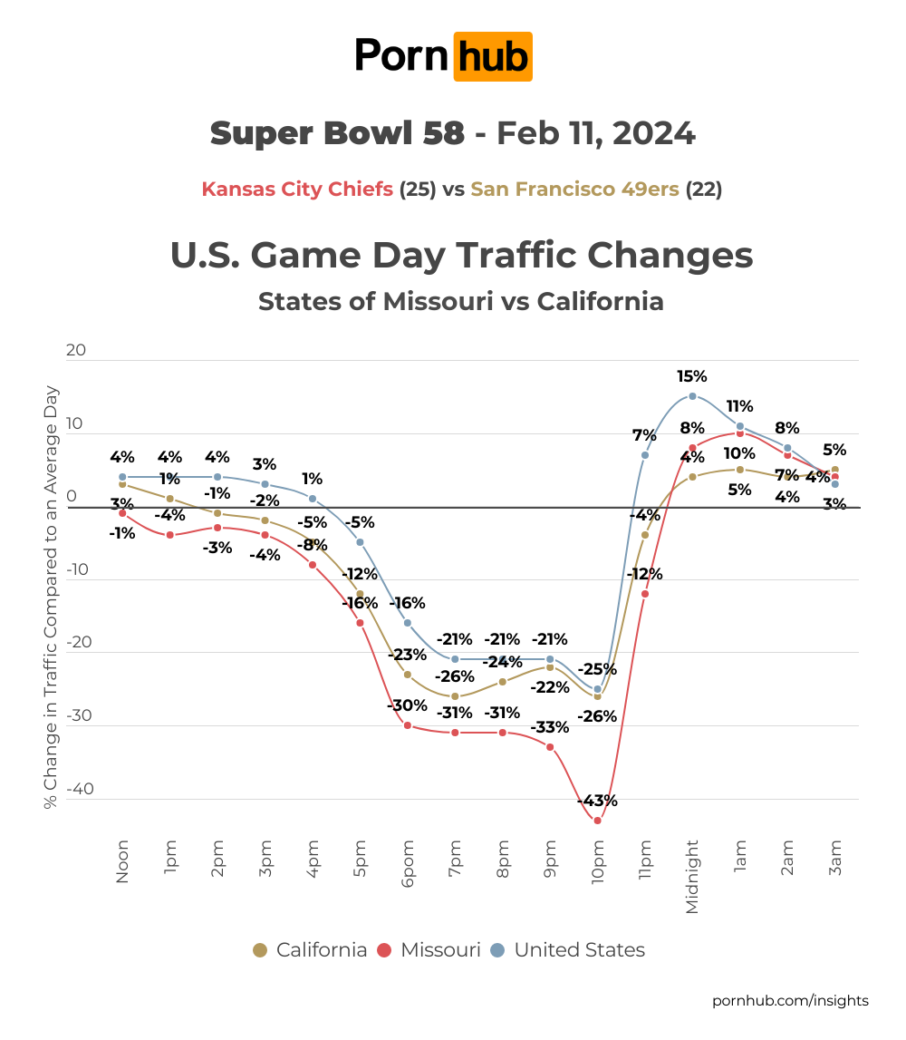 After the game, folks from Kansas City celebrated their win with a big increase in Pornhub viewership by as much as +17% after midnight and continuing in the early morning. On the other hand, San Francisco accepted their loss and headed right to bed, with traffic after midnight being typical for a Sunday night.
