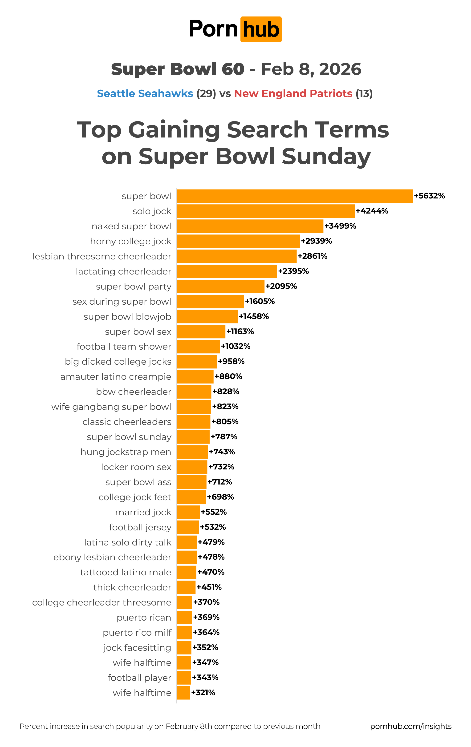 Compared to last month, the top search term is, unsurprisingly, “super bowl” at +5632%. After that, the terms get a little more specific. “solo jock” was up +4244%, “horny college jock” was up +2939%, and “big dick college jocks” was up +958%.