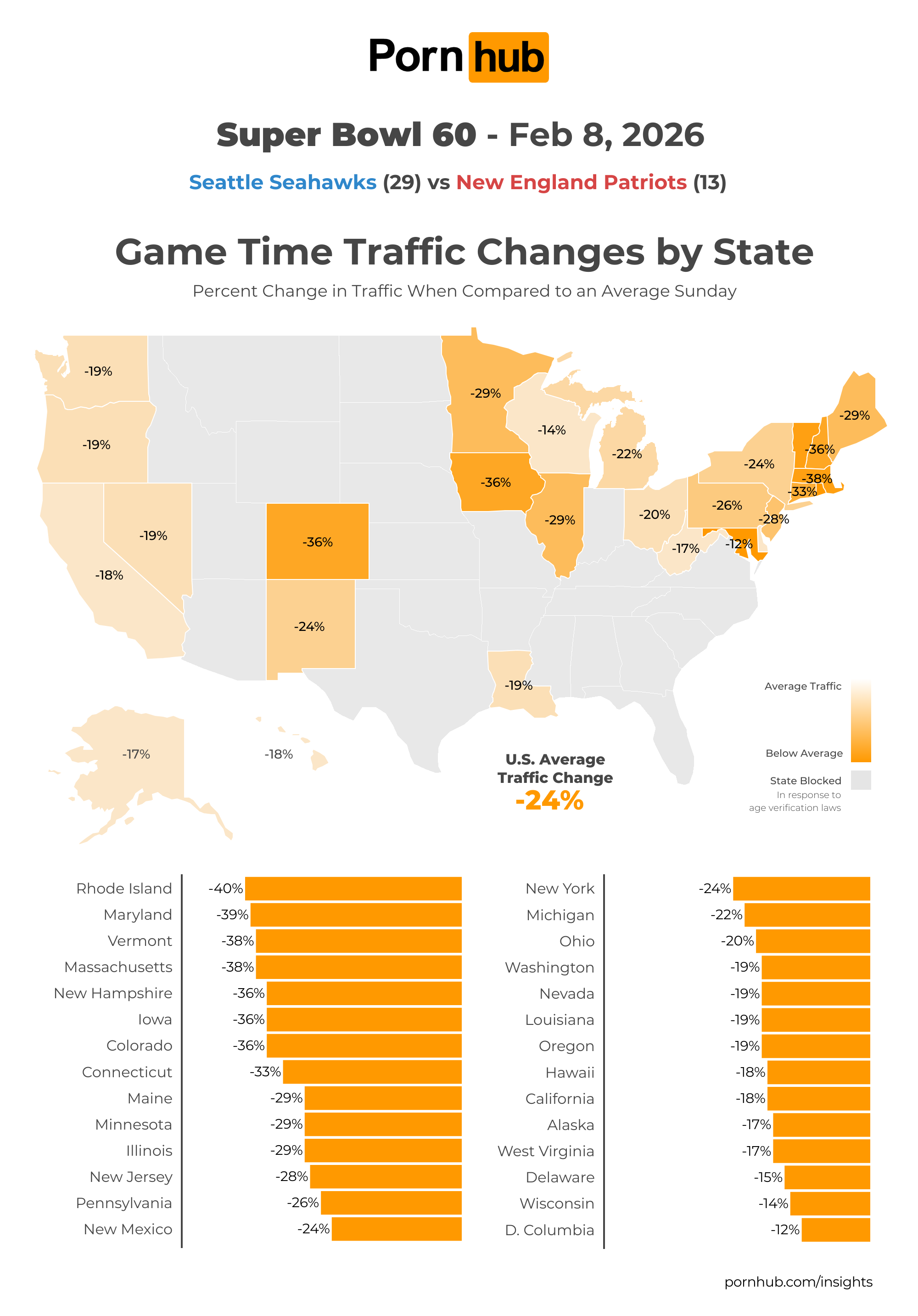 Interestingly, at 8pm, when the Super Bowl halftime show started, traffic in Washington seemed to rush back to Pornhub. 20% of people in Washington visited Pornhub, equating their traffic drop to –14%, whereas traffic in Massachusetts continued their downward trajectory to their all-time low, -44%. Overall traffic in the United States reached its lowest point of the day at 8pm as well, -38%.