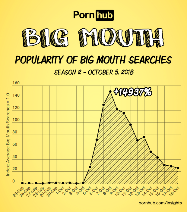 By October 8th, searches were 14,937% higher than their daily average before the new season arrived. In just over a week, 1 million people have searched for “big mouth” on Pornhub. On it’s peak day, searches for “big mouth cartoon” nearly equaled those of “cartoon” (nsfw), one of Pornhub’s usual top 20 searches.