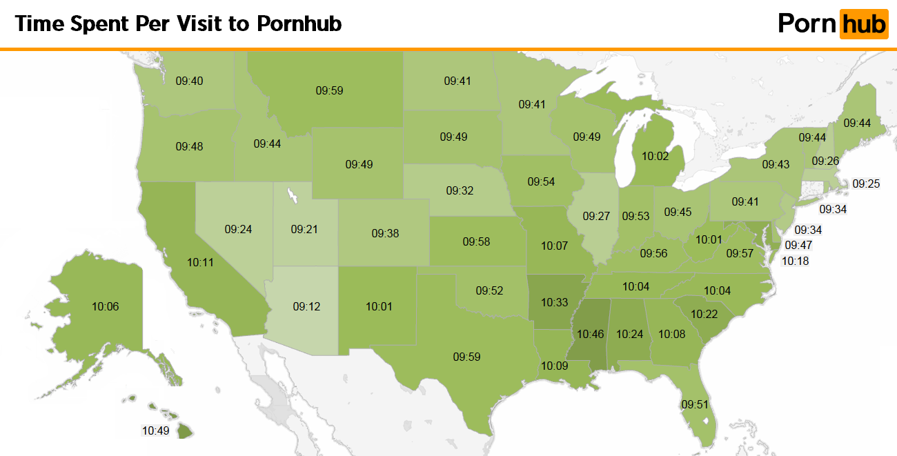 When Hawaii says aloha to Pornhub, they like to stick around. At 10 minutes and 49 seconds, Hawaiians spend more time per visit to Pornhub than any other state. Mississippi isn’t far behind though, at 10 minutes and 46 seconds.