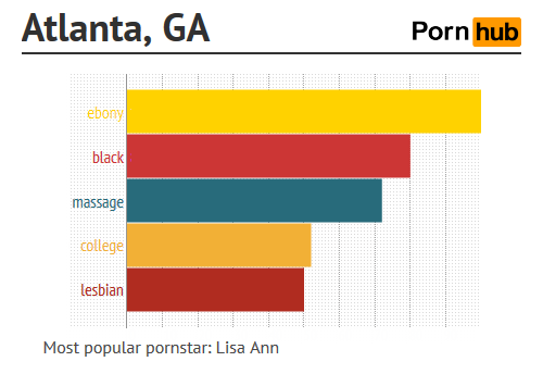 Regionally, “ebony” and “black” are huge across the Southern states, and any cities with a large percentage of African American residents like Detroit. In the Northeast, “college”, “lesbian” and “massage” account for the most searches. On the West coast, “massage” and “teen” are still popular, but other terms like “yoga” and “casting” make the top 5 lists.