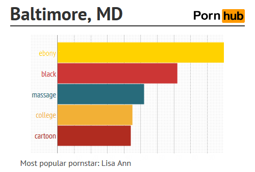 Over 63% of Baltimore’s residents identify as African American, so both “ebony” and “black” take the top search honors by a large margin. It’s also one of only four cities where “Cartoon” makes the list.