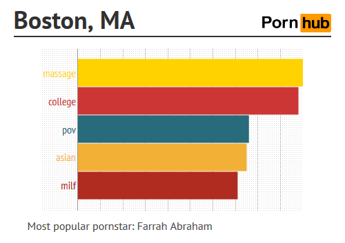 Boston shares it’s porn tastes with most of the US where “massage”, “college”, “pov” and “milf” are most popular. “Asian” also makes the top in this city where almost 9% of the population is of Asian descent. Boston is one of three cities where “Farrah Abraham” takes the top spot for pornstar searches.