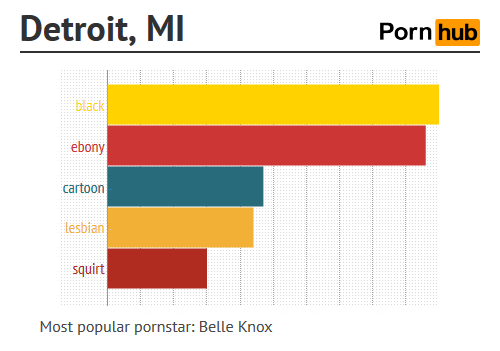 Detroit is the only city where “squirt” makes the top 5 list. With over 80% of the population identifying as African American, “black” and “ebony” take the top two spots. Duke University student and recently outed pornstar “Belle Knox” is the most searched for pornstar right now in the Motor City.