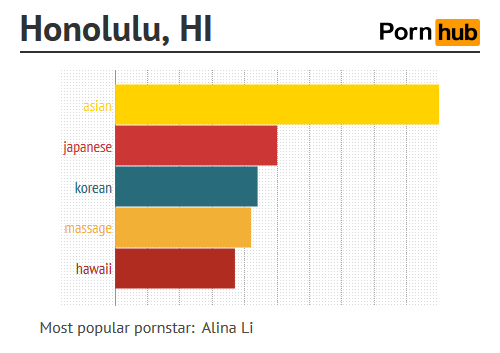 Aloha Honolulu! Hawaii has the largest population of Asian Americans in the US (and over 50% of Honolulu residents), so it’s no surprise that terms such as “Asian”, “Japanese”, “Korean” and “Hawaii” all make the top 5 list. Asian babe “Alina Li” is also the most searched for pornstar.