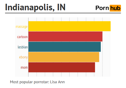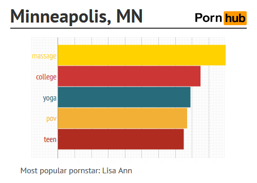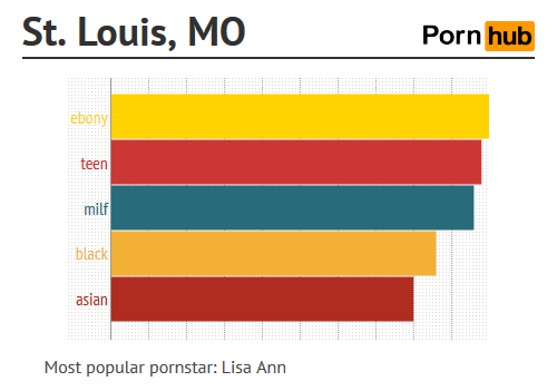St. Louis residents are interesting because of their contrasting searches. Ethnicities “Black” and “Ebony” are in the top 5 along with “Asian”. Both “teen” and “milf” are searched almost equally, and although teen comes out slightly ahead, it’s MILF pornstar Lisa Ann that’s most loved.