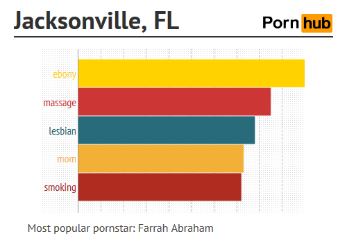 In Jacksonville they also like their ladies “smoking” hot (or at least to be smoking). And teen “mom” “Farrah Abraham” outranks all other pornstars here.