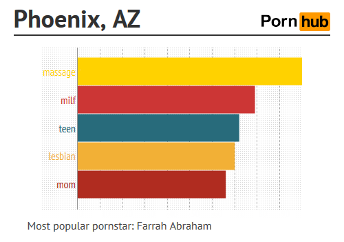 Phoenix is another city where teen mom “Farrah Abraham” is the most searched for pornstar. Is it any surprise then that both “teen” and “mom” also make the top 5 list?