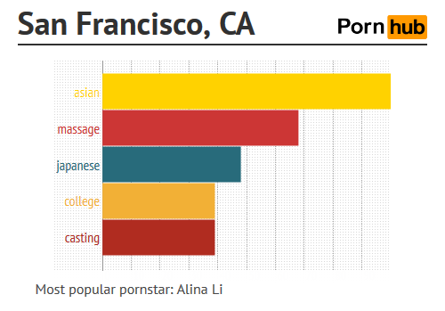 33% of San Francisco’s residents are of Asian descent (according to the 2010 US Census), so much like Honolulu, the word “Asian” takes the number one search spot, and “Japanese” comes in at number three. The most popular pornstar is also Asian babe “Alina Li”. And like their fellow Californians in Los Angeles, there are a lot of searches for “casting”.
