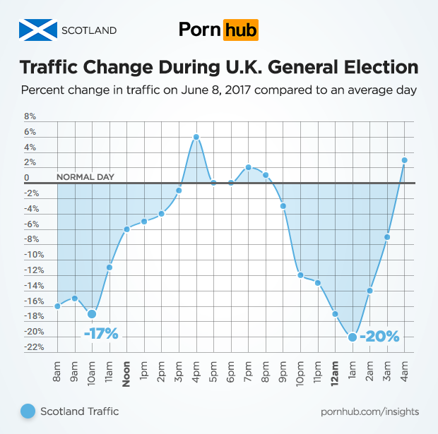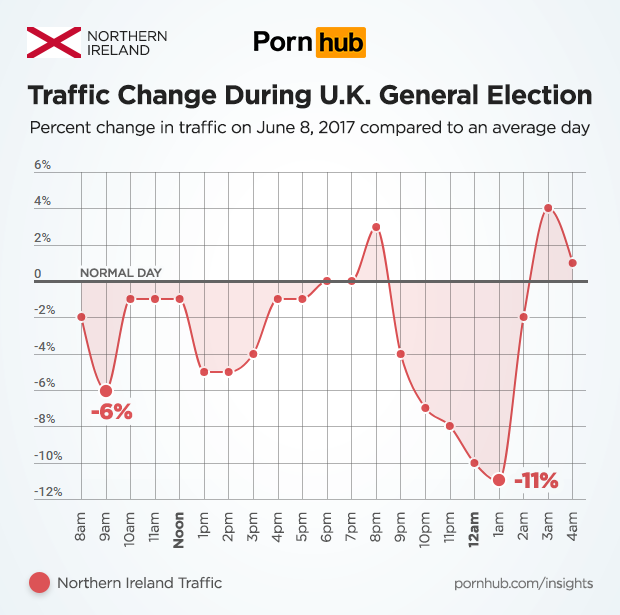 The U.K. General Election took place on June 8, 2017. Just as we found during the U.S. Presidential Election, anticipation of a government change can have an effect on daily traffic to Pornhub. When our friends at Metro UK inquired, our statisticians soon found that across the United Kingdom, traffic was down as much as -14% compared to an average Thursday. In the afternoon and early evening, traffic was up 10% above daily averages, but then fell by -8% at midnight as people awaited results from a hung parliament. After 2am, traffic shot up well above average levels in the wee hours.