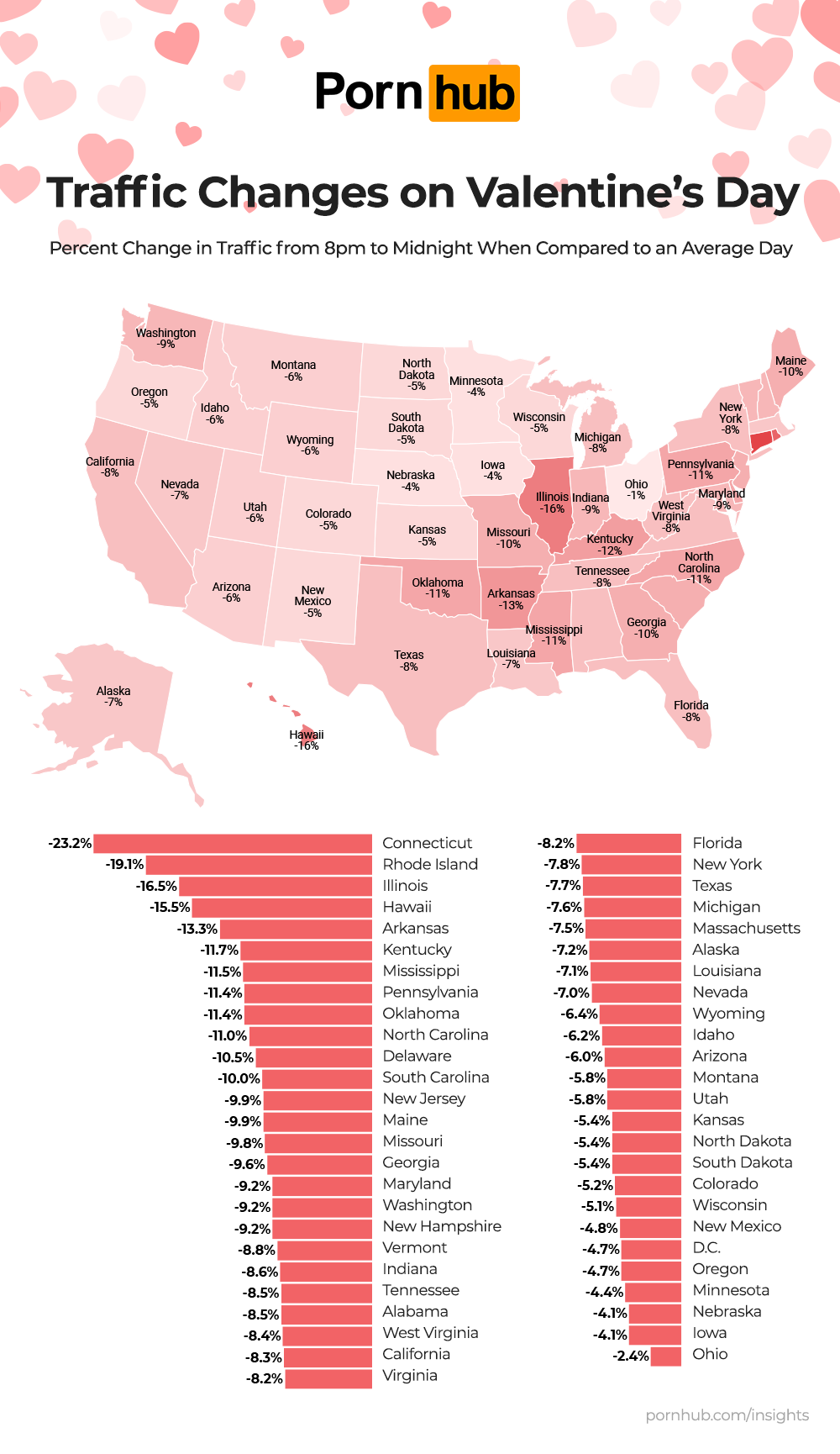 We found Connecticut to have the biggest drop, nearly a quarter more than normal at -23.2%. This was followed by Rhode Island, with a drop of -19.1%, and then Illinois with -16.5%. On the other side of that coin is the states with the least drop in traffic. Unfortunately, Ohio takes home the medal for the least romantic state, with a decrease in traffic of a meager -2.4%, followed by both Iowa and Nebraska at -4.1% respectively.
