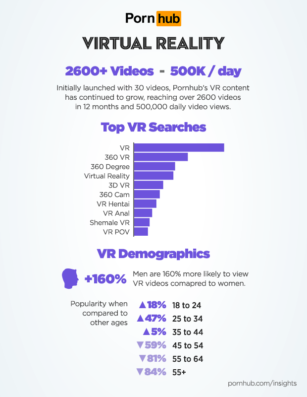 With the increased popularity and accessibility of VR capable devices, VR porn videos are now being watched 500,000 times each day. Compared to other categories, VR visitors typically watch 2 more videos each time they visit Pornhub (11 pages per visit compared to the average 9), while their actual time on site remains about the same at just under 10 minutes. Perhaps the unique visual experience makes them want to test out more new content.