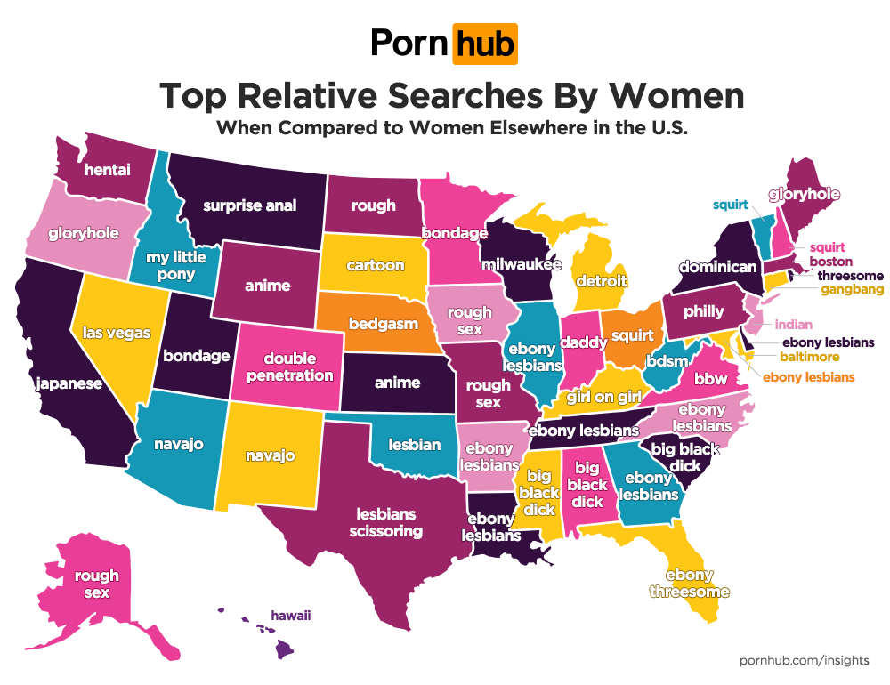 Some other standout searches include a preference for ‘Navajo’ videos in Arizona and New Mexico, ‘bedgasm’ is 52% more popular with women in Nebraska, Idaho’s women like ‘My Little Pony‘ 61% more, and ‘anime’ is 36% more popular in Kansas and 95% more popular in Wyoming.