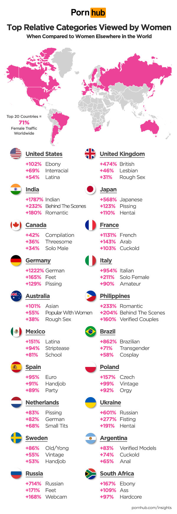 Women in Mexico are 95% more likely to view Striptease videos, in Brazil they’re 71% more into Transgender, in Spain they watch Handjobs 91% more and in the Ukraine they’re 277% more into Fisting.