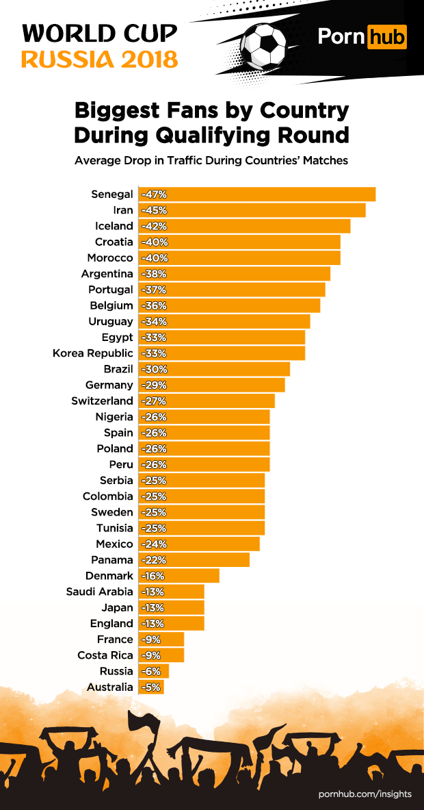 Pornhub’s statisticians first looked at all of the qualifying matches to find the average traffic drop by country when their teams were playing a game. The change was compared to the same time period on an average day two weeks before the World Cup tournament began.